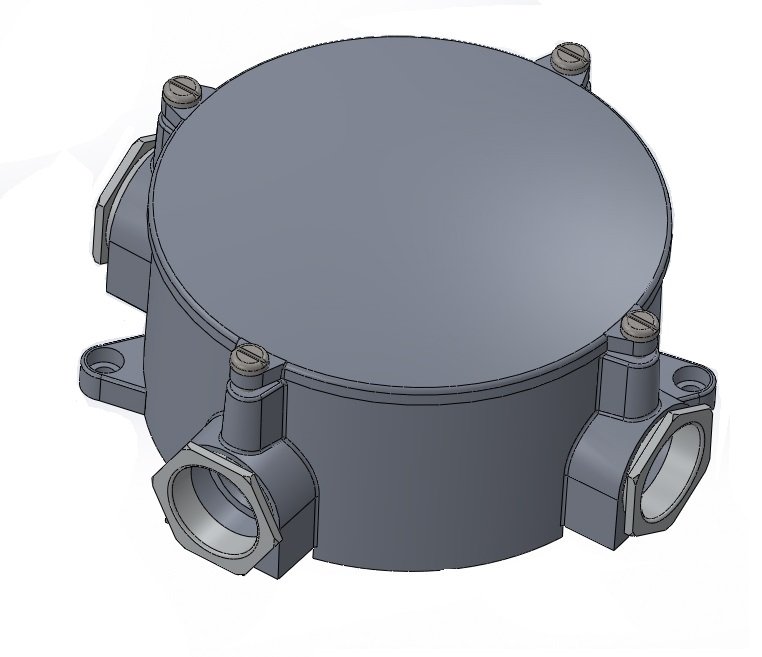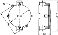 Round boxes, internal Ø 150 mm. Delivered without surface treatment. Aluminium PG 29 cable gland seals, cable Ø 28mm. Mantle terminals 5 x 16 mm2 and 16 mm2 earthing connector.