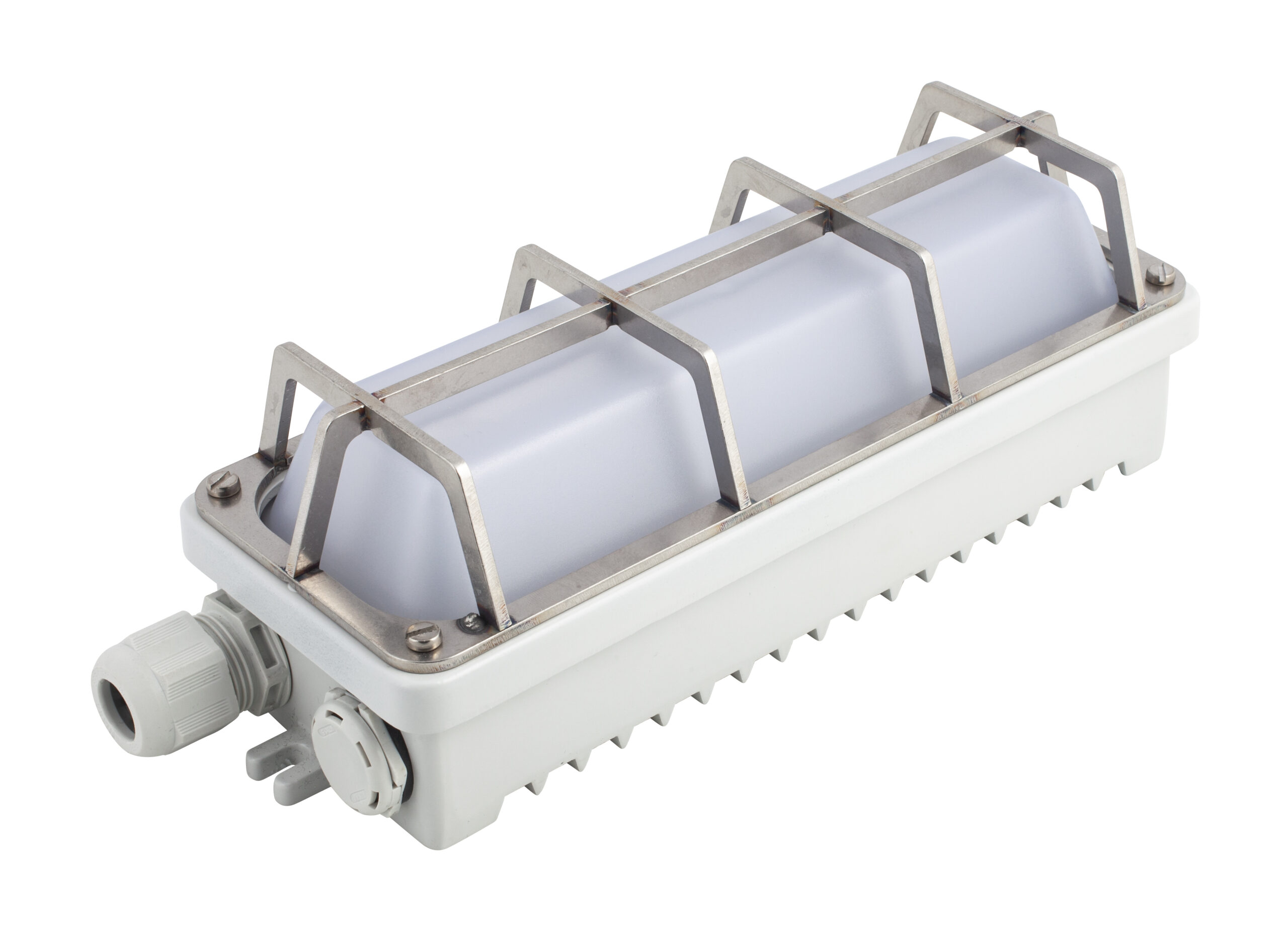 Thanks to its extremely robust construction, the luminaire is suitable for use in wet industrial environments, on ships, in cranes, and in locations where there is a high risk of breakage. The opal diffuser is made of impact‑resistant polycarbonate and is secured to the housing with a frame using four screws.